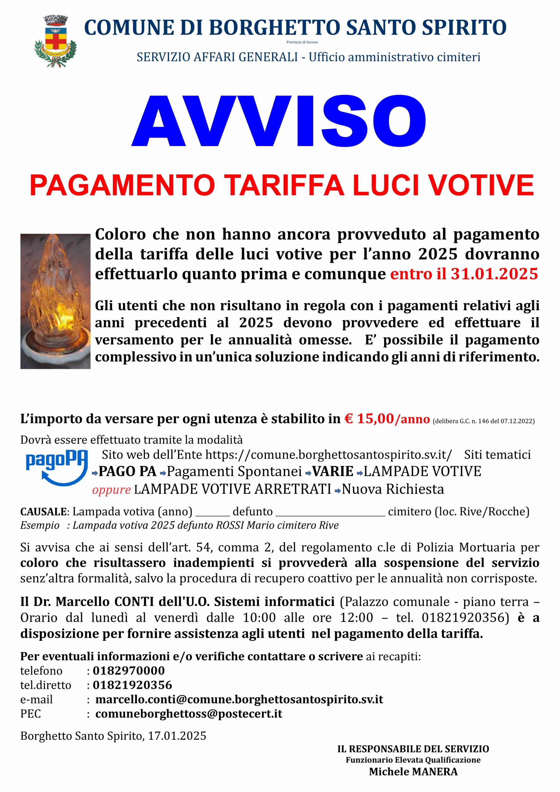 Coloro che non hanno ancora provveduto al pagamento della tariffa delle luci votive per l’anno 2025 dovranno effettuarlo quanto prima e comunque entro il 31.01.2025.