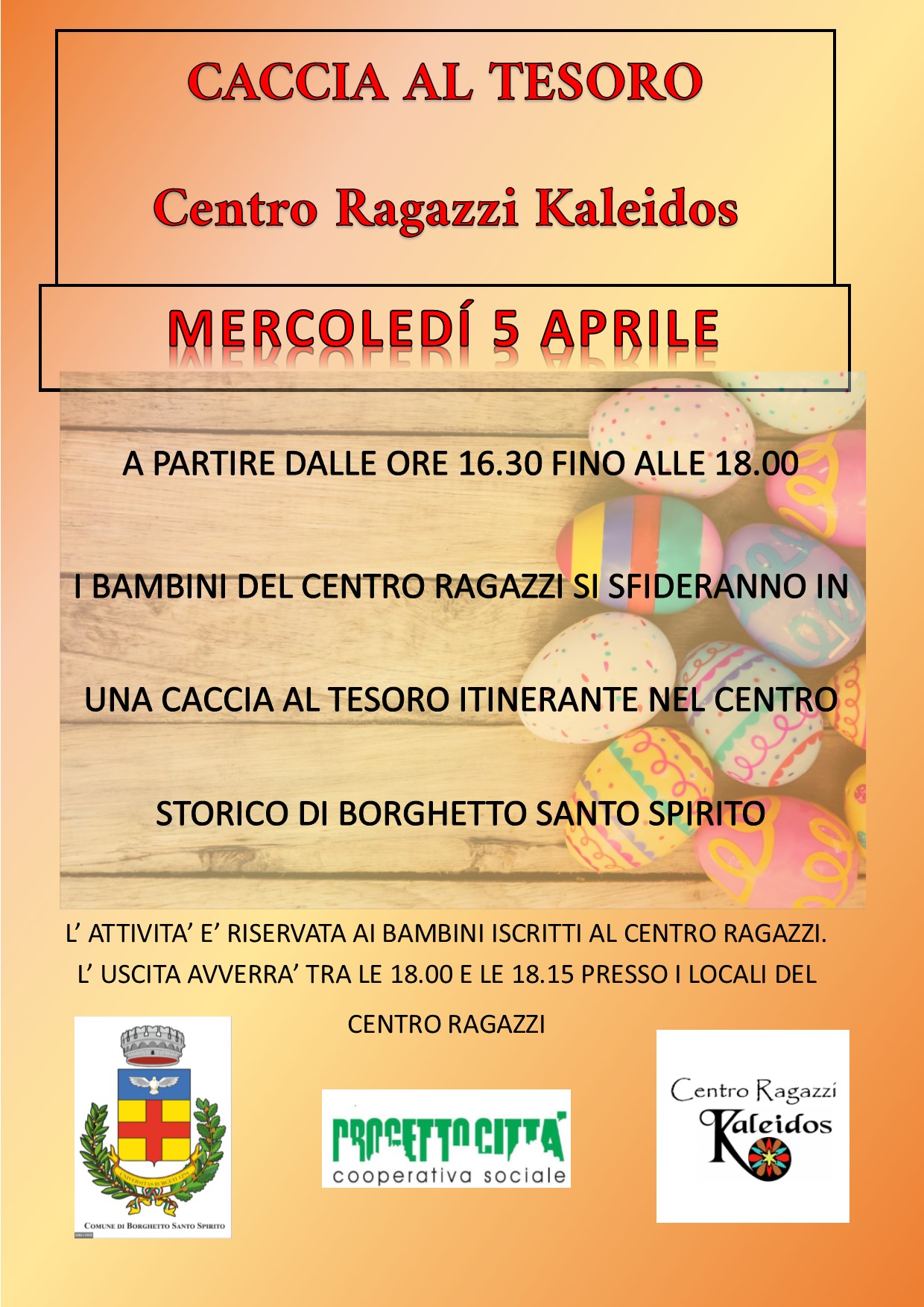 Mercoledì 5 Aprile dalle ore 16.30 nel Centro Storico di Borghetto Santo Spirito, sarà organizzata una caccia al tesoro, da parte del Centro Ragazzi Kaleidos. L’attività è riservata ai ragazzi iscritti al Centro Ragazzi.
