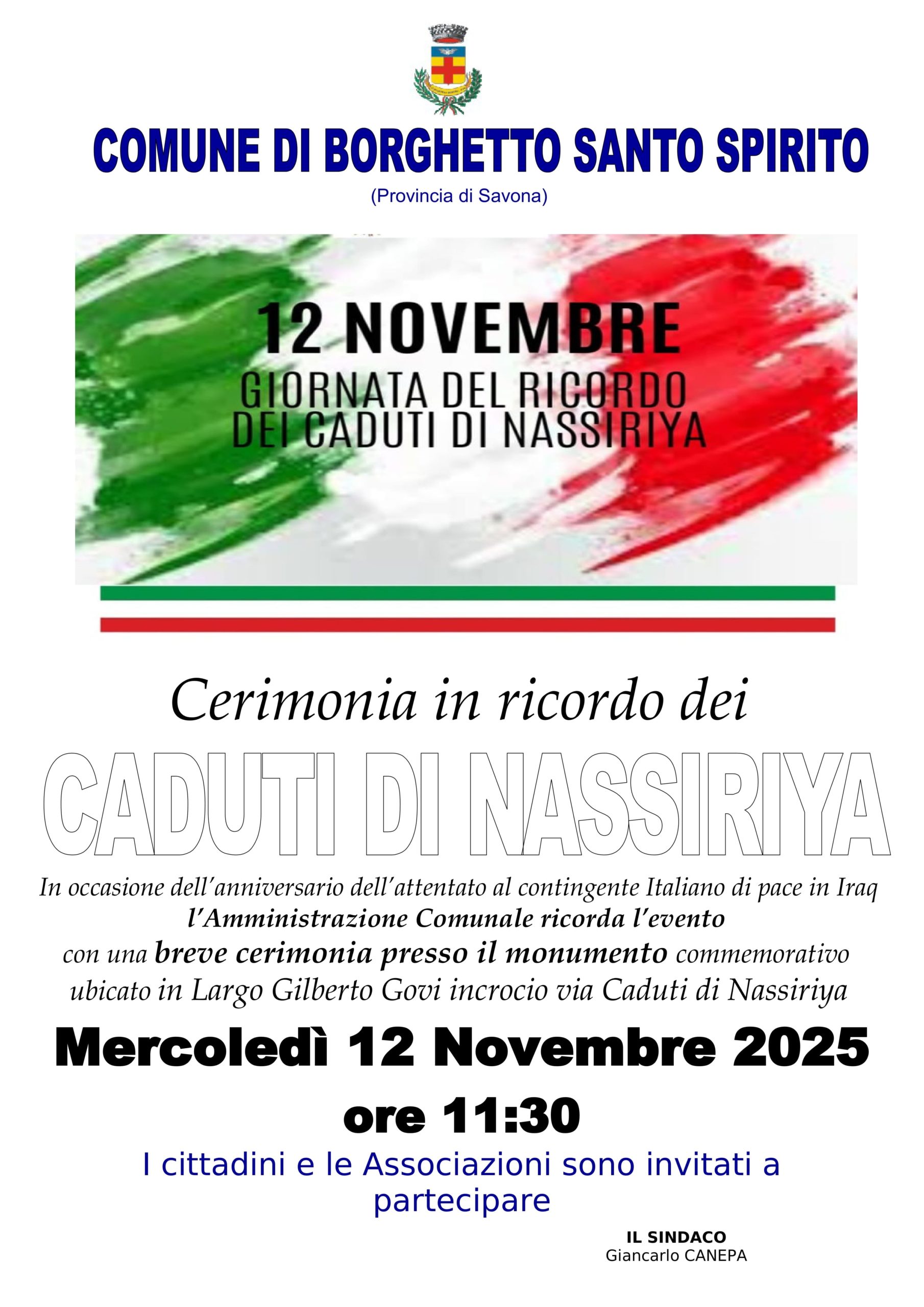 che avrà luogo presso il monumento commemorativo sito in Largo Gilberto Govi incrocio via Caduti di Nassiriya Mercoledì 12 Novembre 2025 – ore 11,30