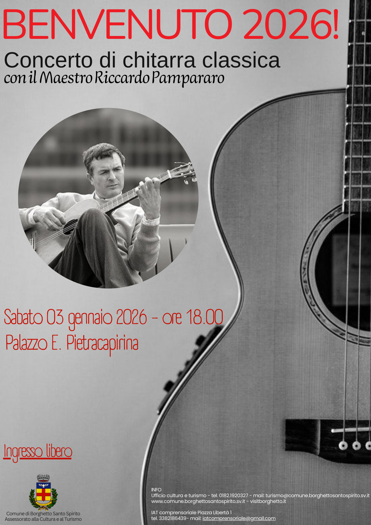 Sabato 3 gennaio, alle ore 18.00, la Sala Polivalente di Palazzo E. Pietracaprina, in Piazza Libertà, ospiterà un imperdibile concerto di chitarra classica con il Maestro Riccardo Pampararo.