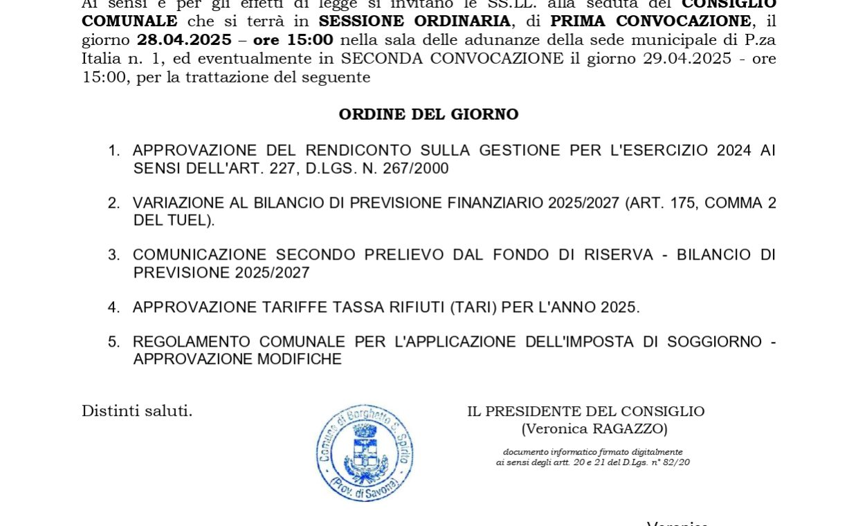 Si comunica che il Consiglio Comunale si terrà in SESSIONE ORDINARIA, di PRIMA CONVOCAZIONE, il giorno 28.04.2025 – ore 15:00 nella sala delle adunanze della sede municipale di P.za Italia n. 1, ed eventualmente in SECONDA CONVOCAZIONE il giorno 29.04.2025 – ore 15:00, per la trattazione del seguente ordine del giorno:
