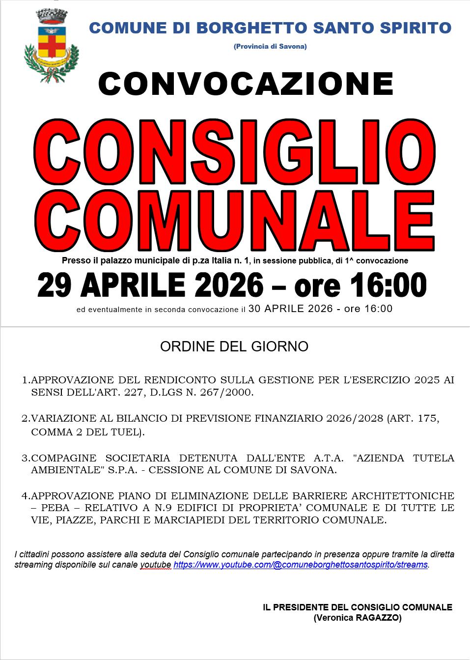 Ai sensi e per gli effetti di legge si invitano le SS.LL. alla seduta del CONSIGLIO COMUNALE che si terrà in SESSIONE ORDINARIA, di PRIMA CONVOCAZIONE, il giorno 29.04.2026 – ore 16:00 nella sala delle adunanze della sede municipale di P.za Italia n. 1, ed eventualmente in SECONDA CONVOCAZIONE il giorno 30.04.2026 – ore 16:00, per la trattazione del seguente ordine del giorno: