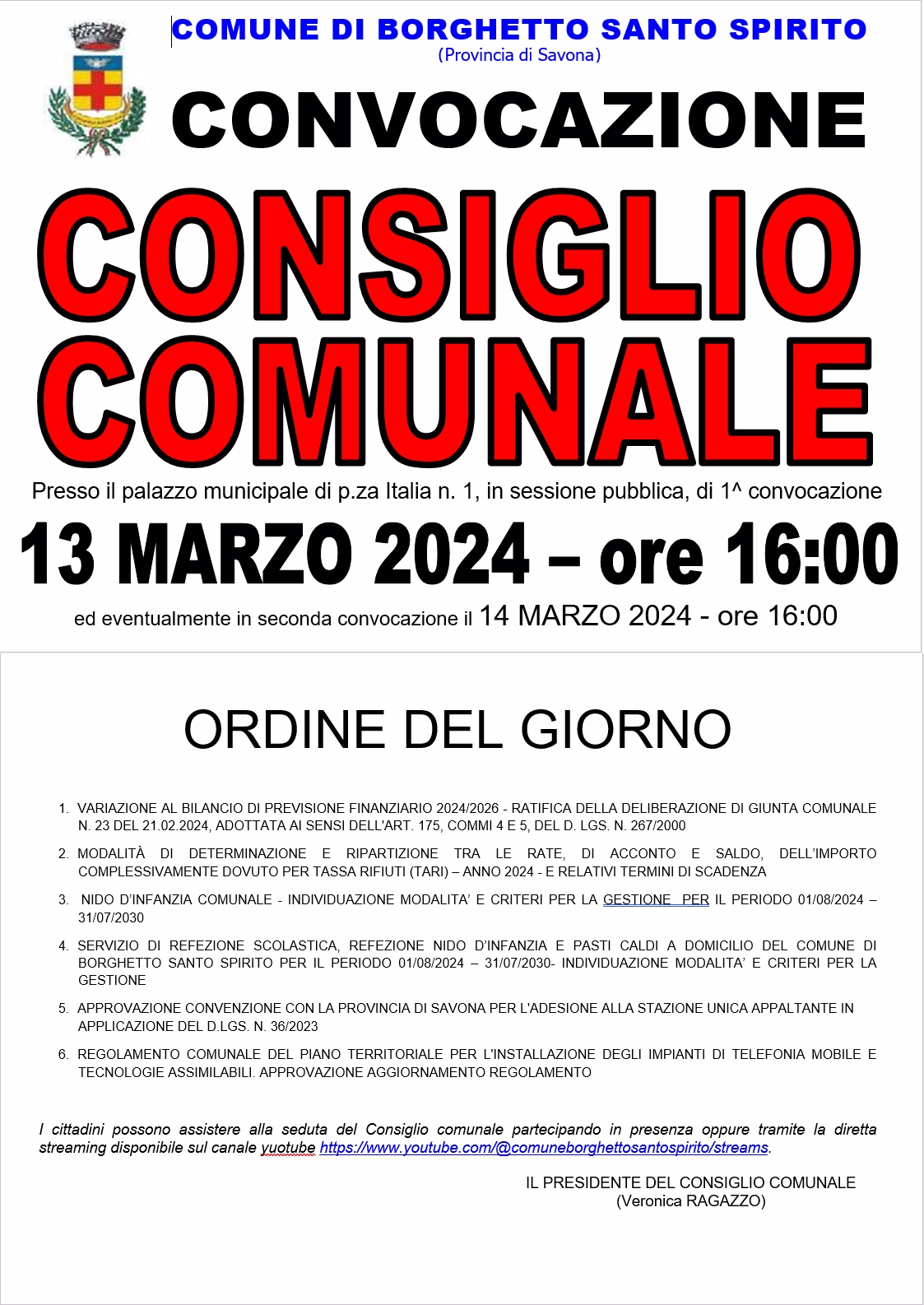 Il Consiglio Comunale è convocato SESSIONE ORDINARIA, di PRIMA CONVOCAZIONE, il giorno 13.03.2024 – ore 16:00 nella sala delle adunanze della sede municipale di P.za Italia n. 1, ed eventualmente in SECONDA CONVOCAZIONE il giorno 14.03.2024 – ore 16:00, per la trattazione del seguente ordine del giorno: