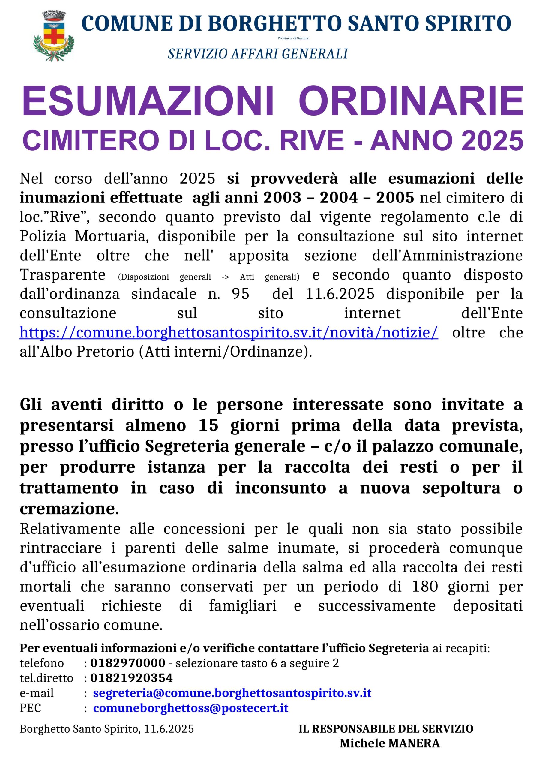 Nel corso dell’anno 2025 si provvederà alle ESUMAZIONI DELLE SEPOLTURE RELATIVE AGLI ANNI 2003 – 2004 – 2005, secondo quanto previsto dal D.P.R. 285/1990, dal vigente regolamento comunale di Polizia Mortuaria e sulla base di quanto disposto dall’ordinanza sindacale n. 95 del 11.06.2025.