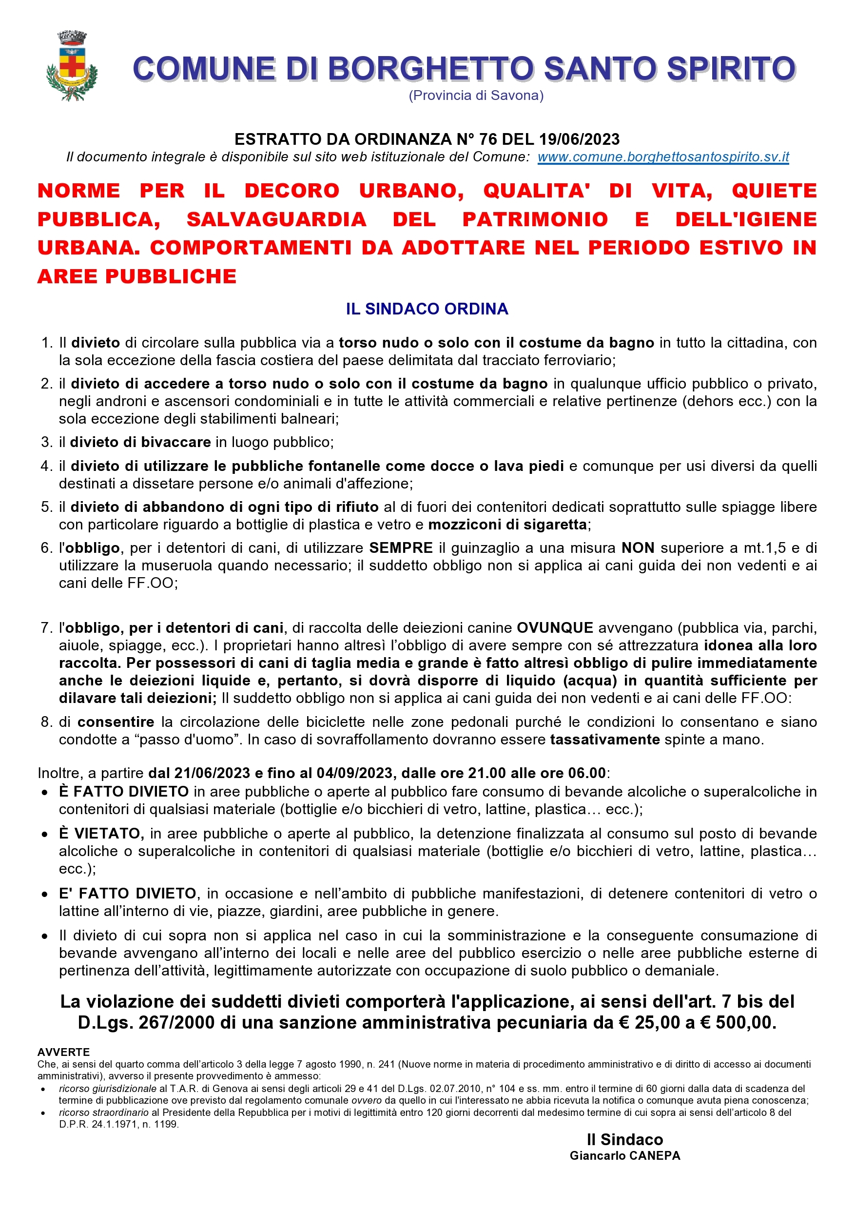 E’ stata emessa dal Sindaco l’ordinanza n. 76 del 19.06.2023 che sancisce pene severe – da 200 a 1.200 euro – per salvaguardare la qualità urbana nel periodo estivo nella nostra cittadina.