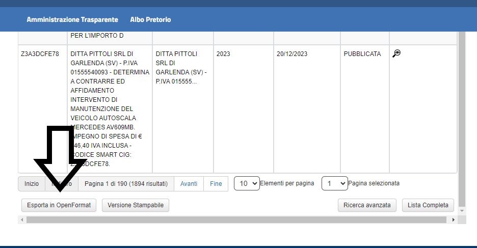 Di seguito immagine a scopo informativo per esportare il file in formato aperto. E’ sufficiente cliccare, una volta selezionato l’anno di interesse, al fondo della pagina della sezione “ Bandi di gara e contratti” il bottone “ Esporta in OpenFormat”.