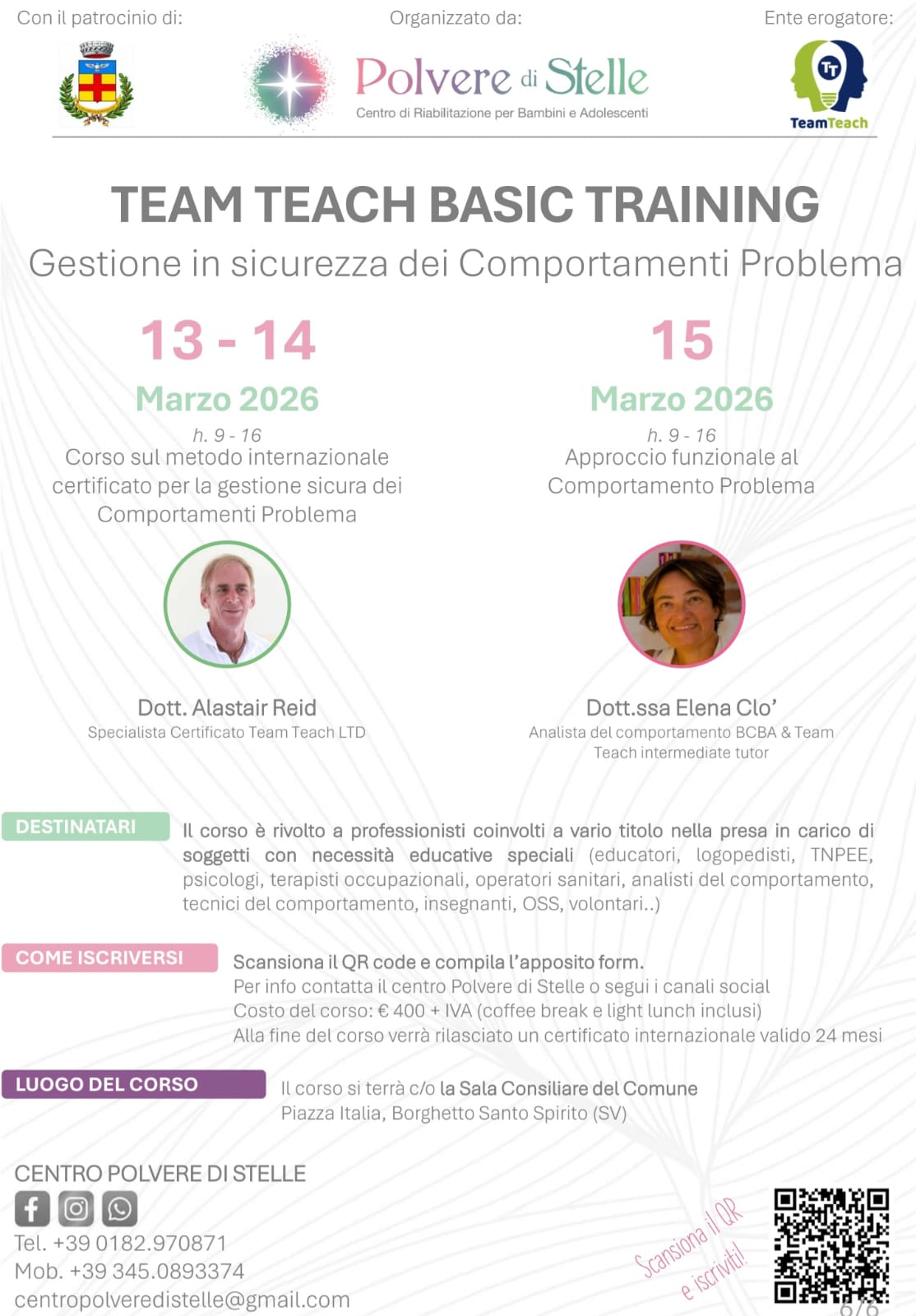 Il centro Polvere di Stelle di Borghetto Santo spirito ha organizzato, con il patrocinio del Comune di Borghetto Santo Spirito, il corso TEAM TEACH BASIC TRAINING – Gestione in sicurezza dei comportamenti problema dal 13 al 15 marzo 2026 dalle ore 09.00 alle ore 16.00 presso la sala consiliare di Piazza Italia.