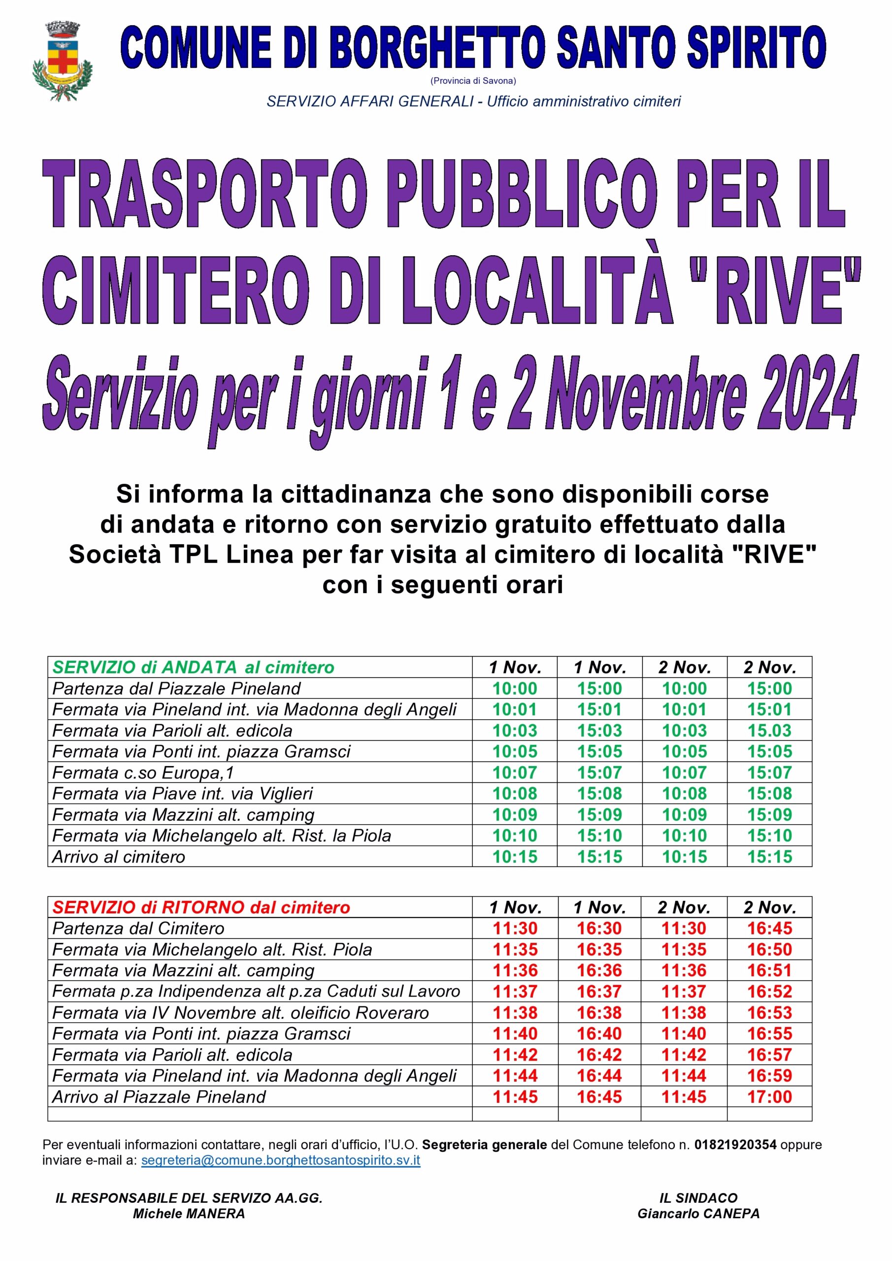 Nei giorni della ricorrenza dei Santi e della commemorazione dei defunti l’attività di trasporto viene incrementata con corse straordinarie a partire dalle ore 10:00 al fine di consentire l’affluenza al cimitero “RIVE” con mezzi pubblici ed alternativi a quelli privati tenuto conto delle condizioni della strada e del limitato numero di parcheggi disponibili in loco, in occasione di una notevole presenza di visitatori.