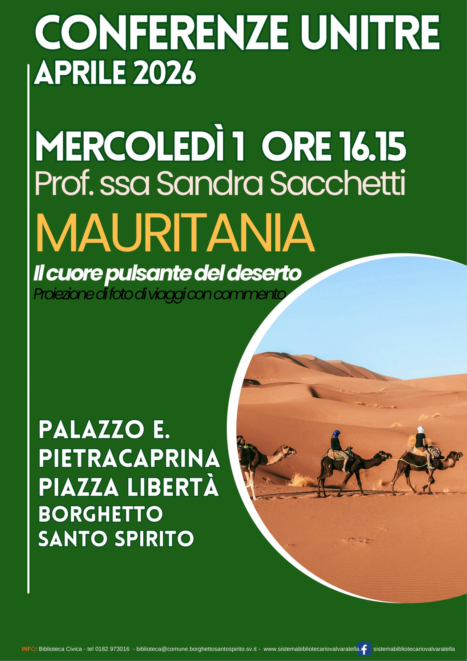 Mercoledì 01 aprile 2026 alle ore 16.15, ultimo incontro dell’Unitre di Borghetto Santo Spirito aperto a tutti, presso la sala polivalente di Palazzo E. Pietracaprina, con un appuntamento dedicato alla scoperta della Mauritania, terra affascinante e ricca di contrasti, dove l’immensità del deserto domina il paesaggio e custodisce storie millenarie.
