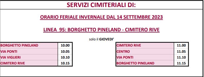 Il Comune di Borghetto ha provveduto con determinazione n. 860 del 06.12.2023 ad affidare a T.P.L. Linea S.r.l. di Savona il servizio di trasporto gratuito da e per il cimitero "Rive", conformemente agli orari e al calendario di seguito indicati.
